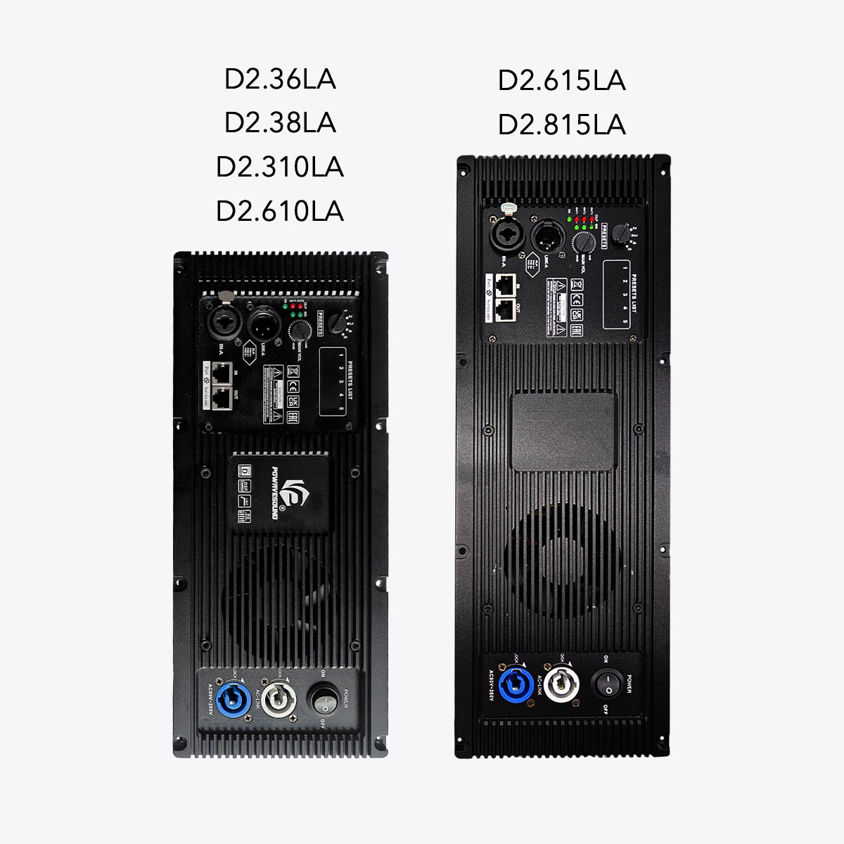 D2.38LA: OUT1: 300W @8Ω, 500W @4Ω; OUT2: 800W @8Ω, 1400W @4Ω D2.310LA: OUT1: 300W @8Ω, 500W @4Ω; OUT2: 1000W @8Ω, 2000W @4Ω D2.610LA: OUT1: 600W @8Ω, 1000W @4Ω; OUT2: 1000W @8Ω, 2000W @4Ω D2.615LA: OUT1: 600W @8Ω, 1000W @4Ω; OUT2: 1500W @8Ω, 2400W @4Ω D2.815LA: OUT1: 800W @8Ω, 1200W @4Ω; OUT2: 1500W @8Ω, 2400W @4Ω |